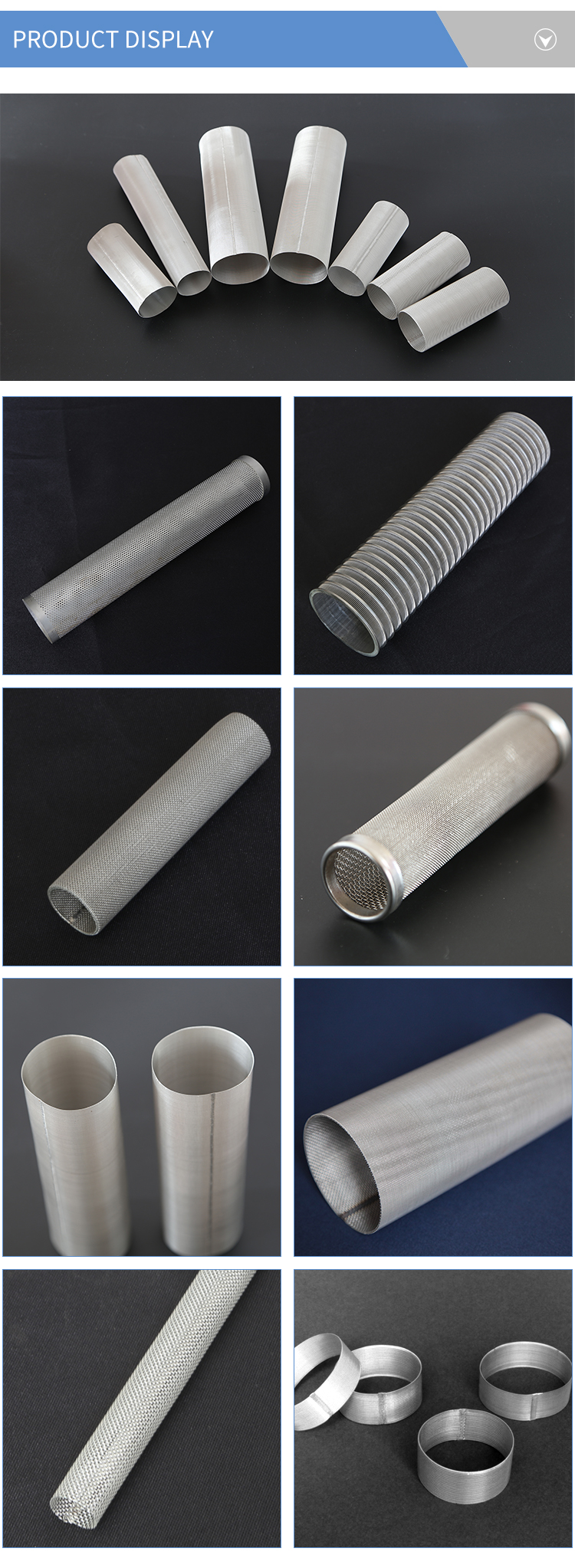 Filter tube/pipe could be woven mesh, expanded mesh, perforated mesh and welded mesh, the material is mainly stainless steel, copper, brass, aluminum which is anti-rust. And this product has perfect filtering performance, the flow rating per unit area is large, which can be used repeatedly after filtering and cleaning to reduce the cost. Our filter tube/pipe products are designed to meet all customized design.
